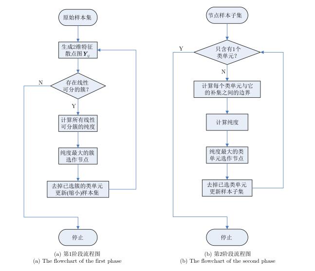 经典决策树由单个特征和阈值来完成节点的分支,本文方法则采用2维特征矢量和边界算法来完成节点的分支。分支过程分为两个阶段,第1阶段寻找线性可分的聚类集团,按照线性可分性将样本集分割成若干子集,每个子集设为一个节点,详述见步骤2;第2阶段对各个节点、亦即线性不可分的各个样本子集做进一步的细分,直至所包含的类单元唯一,分支停止,详述见步骤3,两阶段流程见图 4。