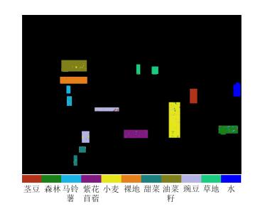 利用训练样本建树之后,对测试样本进行测试,得到了测试结果的混淆矩阵如表 3所示;而全体标记样本的分类结果图如图 5所示,其他未标记样本为黑色显示。