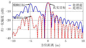 4 实验结果 4.1 1维仿真实验结果本文中使用如表 1所示的参数进行方位向1维回波信号的仿真与处理,在成像中心区域布置一理想点目标,在远离成像主区处布置一产生模糊的点目标,其“鬼影”出现在成像中心区域附近,调整两个目标的强度,使得模糊峰值能量与真实目标峰值能量相当。在处理过程中,选择在多普勒谱±30 Hz处截断带宽,保留低频部分。根据式(5)得到的处理结果如图 6所示,经过评估真实目标处没有明显分辨率损失,而方位模糊峰值处的能量被抑制了13 dB。