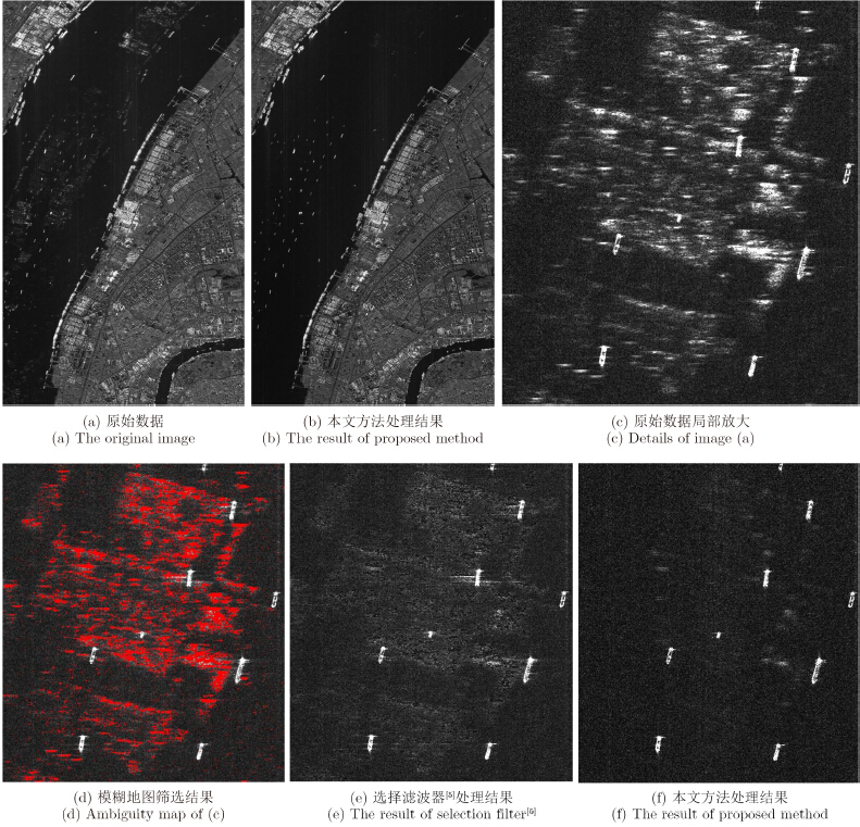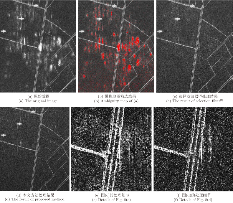 从图 7(a)可见,河道中出现了极为严重的方位模糊现象,干扰到对河道中轮船的识别。其中图 7(d)所示模糊地图为使用选择滤波器[5]所筛选出来的强模糊区域位置,通过修改图层的方法将其标红,可见模糊区与有效主区图像出现部分重叠。使用本文方法对该数据进行处理,可以得到非常“干净”的图像。对处理前后图像中的模糊能量进行评估,发现模糊较强的区域能量下降了约16 dB,较弱的区域也抑制了13 dB;选择没有受到模糊影响的轮船目标进行相关性计算,处理前后该目标相关系数达到0.99。