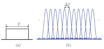 其中,${W_k}\left( {k = 0, 1, \cdots, N - 1} \right)$是调制符号,对应着第k子载波的复权值$\sum\nolimits_{k = 0}^{N - 1} {{{\left| {{W_k}} \right|}^2}} = N$ 。T是不包含CP的OFDM信号长度,$\Delta f$为子载波间隔。为避免OFDM子载波间干扰,需要保持子载波正交性,这就需要每个子载波的频域结构与子载波间隔相结合,如图 2所示,满足1/T=$\Delta f$。假设OFDM采样间隔为Ts=T/N=1/B,则OFDM信号可通过对权向量逆傅里叶变化方式获得。