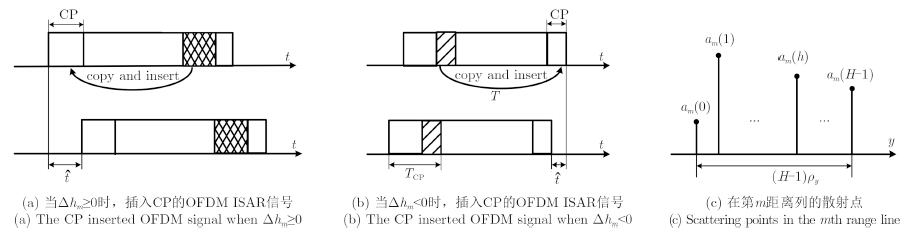 离散OFDM信号${{s}} \!=\! {[\begin{array}{*{20}{c}} \!\! {S\left( 0 \right)} \, {S\left( {{T_{\rm s}}} \right)} \, \, \cdots \, \, {S\left( {(N \!\!-\!\! 1){T_{\rm s}}} \right)} \!\! \end{array}]^{\rm{T}}}$为权向量${{w}} = {[\begin{array}{*{20}{c}} \!\! {{W_0}} \, \, \, {{W_1}} \, \, \cdots \, \, {{W_{N - 1}}} \!\! \end{array}]^{\rm{T}}}$的N点信号矢量。对于非合作目标,目标平动带来的距离向偏移会降低OFDM成像的质量,与文献[6]中的忽略距离偏移误差的方法不同,通过插入足够长度的CP,本文提出了针对非合作目标的无IRCI的距离像重构算法。假设距离向有H个距离单元,Δhm是第m个距离列由于平动引起的距离偏移分辨率数目,$\Delta {h_{\max }} = \mathop {\max }\limits_m \{ |\Delta {h_m}|\} $。为避免所有距离列的IRCI,保证回波信号的正交性,CP的长度需要满足${N_{\rm{CP}}} \ge H + 2\Delta {h_{\rm max}} - 1$[6],在这种情况下,一个距离列的所有距离单元的回波时间延迟$\hat t$不会超过TCP,发射信号的模拟长度为T+TCP。CP插入的具体过程如图 3(a),图 3(b)所示。与基于CP的SAR成像[6, 7]相比,此处CP的长度不仅与距离单元有关,还要考虑平动误差的影响。
