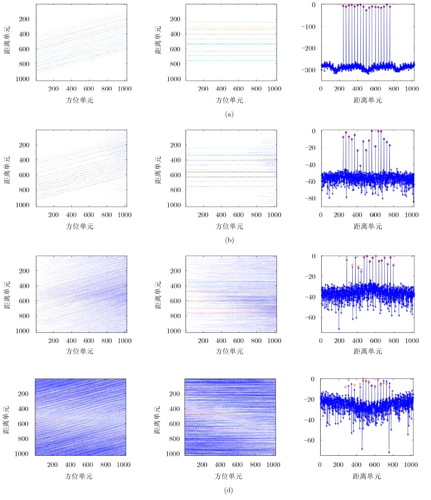 如图 4中红色圆圈所示,17个散射点的幅度是随机产生的,其余距离单元散射点振幅为零,在距离脉压后,不同CP长度的回波OFDM信号如第1列所示,运动目标的走动导致了CPI内距离包络的偏移和检测性能的下降,距离校正算法需对距离偏移误差进行补偿。如第2列所示,利用本文提出的包络对齐方法,可把在同一距离的散射点校正到同一距离单元。为了进一步说明算法的性能,估计的距离列的规范化距离像在第3列用蓝色星线表示,估计所得速度和加速度结果在表 1中列出。图 4和表 1表明,当CP长度为NCP=H+Δhmax-1=826时,所估计得到的点散射点速度、加速度和幅度都比较准确,散射点幅度为零的区域,估计幅度结果低于-270 dB(主要来源于电脑计算误差),随着CP长度的下降,估计的准确性变低,当不考虑距离偏移对CP的影响时,即CP长度为距离单元数512时,估计的准确性进一步变低,IRCI增强,特别地,当CP长度为0时,一些散射点甚至湮没于IRCI中。因此,只有插入足够长度的CP才可以获得无IRCI的ISAR图像。