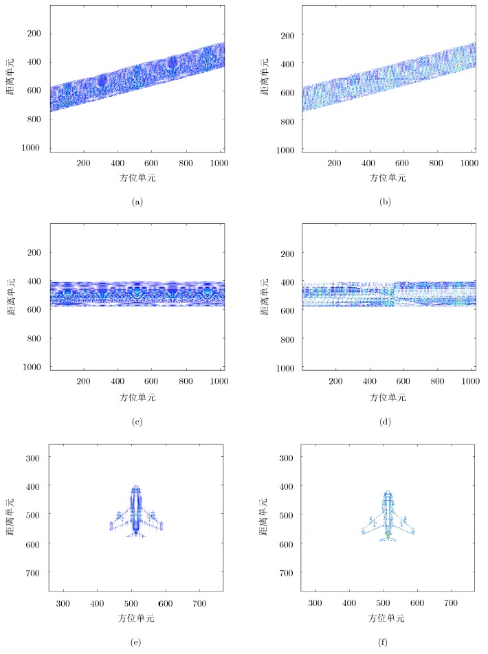 下面,我们验证Yak-42散射模型,进行仿真分析本文算法对OFDM-ISAR成像的运动补偿性能。雷达与目标运动参数均与上面实验一致,应用步进频波形和插入CP的OFDM波形的距离脉压结果分别如图 5(a)和图 5(b)所示,两者均需要运动补偿来校正距离偏移。图 5(a)利用最大相关法和图 5(b)应用修正的最大相关法的包络对齐结果如图 5(c)和图 5(d)所示。为了增加校正的准确性来避免图像模糊,需进一步对误差相位进行校正,图 5(e)和图 5(f)为传统WLSE算法应用到图 5(c)和本文所提算法应用到图 5(d)所得结果,图 5(f)所示结果由于抑制了IRCI,其成像质量远远高于普通算法所得结果。