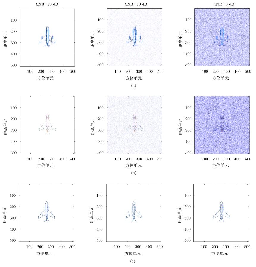 最后,验证噪声对本文算法的影响,假设已通过包络对齐补偿距离偏移,相位误差形式是随机的,由雷达与目标相对速度产生,相对速度范围为-10~10 m/s。步进频波形WLSE算法,插入CP的OFDM波形WLSE算法,插入CP的OFDM波形的本文算法结果分别如图 6(a),图 6(b)和图 6(c)所示。加入高斯白噪声,从左到右SNR为20 dB, 10 dB和0 dB,当SNR较高时,3种算法都可取得较好的相位补偿效果,然而,由于IRCI的存在,步进频波形WLSE算法旁瓣较高,而插入CP的OFDM的WLSE算法和稀疏校正算法抑制了IRCI。尽管插入CP的OFDM的WLSE算法可有效抑制IRCI,但随着噪声的增强,图像湮没在噪声中,而本文所提算法在强噪声环境下依然可以恢复无IRCI距离像并校正相位误差。实验说明了本文算法通过解决稀疏优化问题对相位误差进行校正,具有优越的噪声抑制效果。