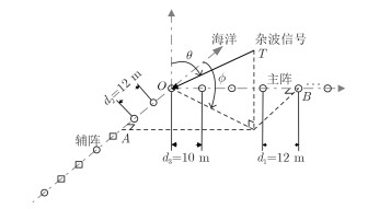 基于CS的DOA估计理论在来波信号稀疏的情况下,可以用较少的快拍数以较高的概率重构回波信号。由于在单个距离-多普勒单元上,电离层杂波的来波方向非常少,符合CS的应用条件。故本文使用基于CS的单快拍测角算法[18]进行电离层杂波测向。具体地,对L型阵列中主阵接收到的回波信号和辅阵接收到的回波信号分别用上述方法测角,得到在直角坐标系下的回波信号与主阵的夹角∠TOB及回波信号与辅阵的夹角∠TOA,如图 1所示。为方便起见,记α=∠TOA, β=∠TOB。
