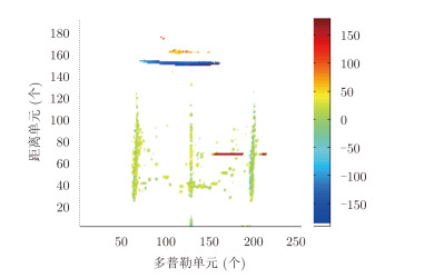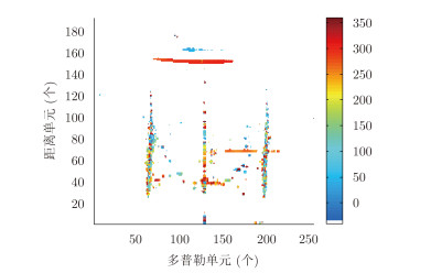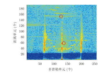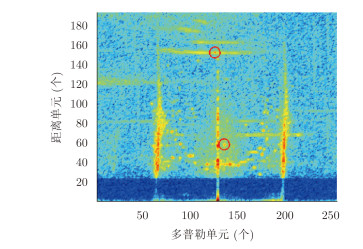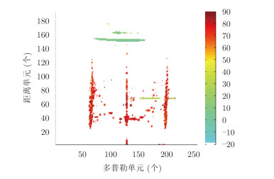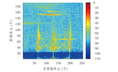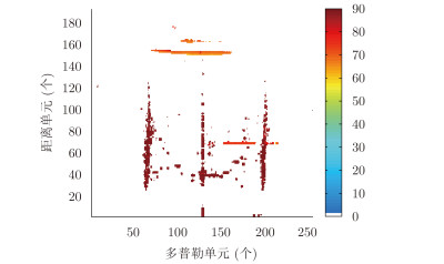 2.2 信号模型及基本信号处理过程各个通道接收到的远场回波信号一般在经过混频、采样、正交双通道处理和相干积累后,先得到距离域信息,然后将距离域的信号做快速傅里叶变换(FFT),得到信号的频域信息。为了更好地表现回波信号的多普勒效应及其信息,一般将频域转变到信号的多普勒域,最后得到距离-多普勒谱(Range-Doppler spectrum, RD谱)。一个垂直极化通道形成的RD谱如图 2所示。图中横坐标表示多普勒单元,纵坐标表示距离单元,各个距离-多普勒单元的功率根据数值大小用不同的颜色表征。