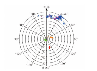 从图 3所示的俯仰角谱可以看到,电离层杂波的俯仰角主要来自天顶方向和斜向,而海杂波和目标信号主要来自俯仰角很大的海面方向。从图 4所示的方位角可以看到,目标信号和海杂波的方位角主要集中在正负45°之间,而尽管在每个区域中的电离层杂波方位基本一致,不同区域的电离层杂波却对应于不同的方位角,表明不同区域的电离层杂波是由不同的电离层反射产生的,且各个电离层对应的方位角不同。