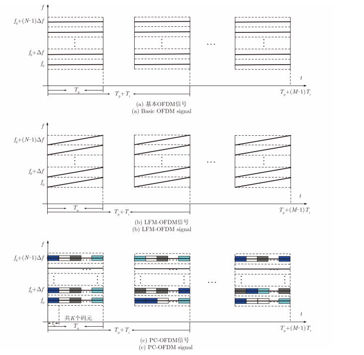 OFDM雷达的子载频上可以进行任何形式的调制,最常见的有线性调频调制(Linear Frequency Modulation,LFM)和相位编码(Phase Coded,PC)调制,分别称为LFM-OFDM和PC-OFDM,其与基本OFDM信号的区别如图 1所示。图 1(a)是基本的OFDM信号,每个子载频是单载频,子载频之间的频率间隔为Δf;图 1(b)是LFM-OFDM信号,每个子载频采用线性调频,带宽均为Δf;图 1(c)是PC-OFDM信号,每个子载频上采用相位编码调制,且子载频频率间隔Δf和码元宽度tb满足Δf= 1/tb。这种PC-OFDM信号脉内、脉间子载频上编码可以相同也可以不同,设计非常灵活,而且还具备一些独特优点,如抗干扰能力强、易于数字化、通信雷达一体化等,因此这种信号是OFDM雷达研究的热点。