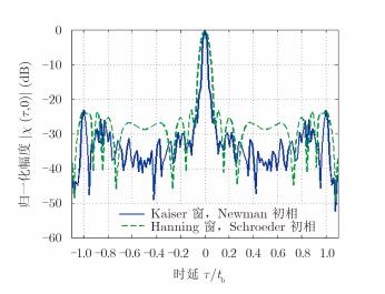为了进一步分析子载频加权方式的影响,图 11比较了图 9中两种加权信号的自相关函数。为了分析两种加权方式对信号距离分辨的影响,截取延迟为一个码元长度内的曲线,可以明显看出,Kaiser窗组合Newman初相加权,主瓣更窄,码元内部旁瓣更低。综合信号PMEPR、距离分辨考虑,Kaiser窗、Newman初相加权是一种较为理想的子载频加权方式。