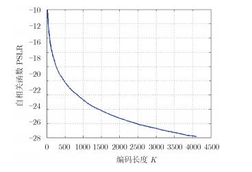 最后,考虑编码序列长度对相位编码序列自相关函数旁瓣水平的影响。以峰值旁瓣比(Peak-to-Side Lobe Ratio,PSLR)作为指标衡量信号的相关函数旁瓣水平,以相同的混沌初值产生不同长度的Bernoulli混沌量化编码,产生不同相位编码数的子载频数N=32的相位编码OFDM信号,并求取自相关函数PSLR值。重复上述步骤并求最终的平均值,以消除混沌初值对结果的影响。由图 12可知,随着编码长度K的增加,信号自相关函数PSLR不断降低,相关性能更加优良。这是由于Bernoulli量化相位编码序列自身的相关性能随着序列长度的增加趋于优良所决定的。然而,相位编码序列长度也不能无限增加,在脉冲宽度的一定的情况下,码元宽度随着序列长度增加而减小,而在现有硬件环境下,相位跳变的速率是有限的,序列长度过长,势必导致误差的产生,且后续处理较为复杂。