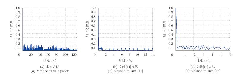 图 13为本文方法与现有的经典算法[14, 15]在距离分辨率上的比较。其中图 13(a)为子载频数N=15,相位编码长度K=128,随机产生混沌初值x0= –0.332746454505278,β=1.2 Kaiser窗、Newman初相加权四相编码OFDM信号,图 13(b)为采用15位多相Barker码调制,同样为β=1.2 Kaiser窗、Newman初相加权的IS PC-OFDM信号,图 13(c)则为最小二乘准则下同时最优化模糊函数、PMEPR的PC-OFDM信号。其中,图 13(a),图 13(b)中信号PMEPR均等于1.7107,而图 13(c)中信号PMEPR等于1.8949。经过比较,我们可以看到,本文方法通过增长编码序列的长度使得自相关函数旁瓣水平与其他两种方法相当。信号时间-带宽积更大,但是相应地信号处理复杂度有所提高,且旁瓣水平略高于另两种方法,并依赖于初值选择和编码长度。然而,相对于图 13(b)中采用相对固定的序列进行编码,本文方法抗截获、抗干扰性能更好,且参数设置更为灵活;图 13(c)中的最小二乘准则下的优化算法原则上可以优化设计任意子载频数和编码长度的PC-OFDM信号,而其迭代次数也随着这两个参数的增大而增大,相对而言,本文方法算法复杂度较低,且信号PMEPR控制得也更好。