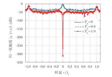 $ \begin{array}{l} \chi (\tau ,\upsilon ) = \int_{ - \infty }^{ + \infty } {u(t){u^*}(t + \tau )\exp \left( {{\rm{j}}2\pi \upsilon t} \right){\rm{d}}t} \\ \;\;\;\;\;\;\;\;\;\;\;\;\; = \sum\limits_{n = 0}^{N - 1} {\sum\limits_{l = 0}^{N - 1} {{w_n}w_l^*\exp \left( { - {\rm{j}}2\pi l\frac{\tau }{{{t_{\rm{b}}}}}} \right)} } {\chi _{n,l}}\left( {\tau ,\upsilon } \right) \end{array} $ | (14) |