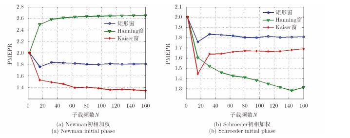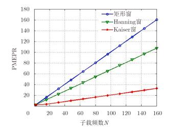 进一步地,设置子载频数N为不同数值,分别计算信号PMEPR,可以得到不同窗函数的PMEPR随N变化的曲线如图 4所示。从图中看出,PMEPR随子载频个数N的增大近乎直线增加,尽管经过Kaiser窗加权,PMEPR大大降低,但仍未达到技术指标要求,说明单一采用幅度加权不能控制信号的PMEPR。