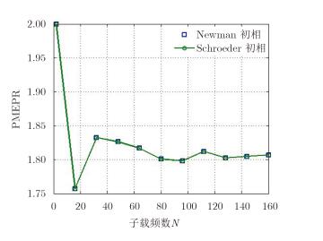 32个子载频合成单码元OFDM信号包络见图 5。由图可得,初相加权完全改变了信号包络形状,且大大降低了包络峰值,且Newman初相加权和Schroeder初相加权信号包络形状完全一样,只是平移了一个采样点。对不同子载频个数OFDM单码元信号包络,分别计算PMEPR,可以得到不同初相加权信号PMEPR随N变化的曲线如图 6所示。从图中看出,表 2中的两种初相单独加权是等效的,均可以将PMEPR控制在2左右,并且随着N增大,PMEPR趋于稳定在1.8左右,若要得到更低的PMEPR,则需要将初相加权与幅度加权相结合。