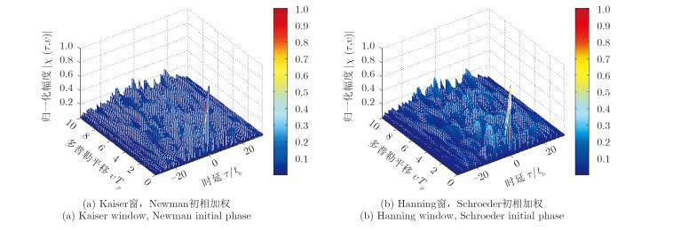 实验采用上一节中讨论的,包络峰均比控制较好的两种加权方式对N=32个子载频进行加权,并用同一个K=32长的Bernoulli混沌量化四相编码序列对信号各载频进行调制,在混沌吸引域[–0.5,0.5)中随机产生Bernoulli混沌初值为0.3147。信号码元宽度tb=0.2 μs,则脉冲宽度Tp=6.4 μs,带宽B= 160 MHz,发射基带频率f0=10 GHz。求取两种信号模糊函数如图 9所示。两种加权方式下,信号的模糊函数均呈图钉状,具有单一的峰值,其余能量较为均匀地分布于距离-多普勒平面,较为狭窄的中心峰值意味着该种信号具有距离、多普勒高分辨,因而同时具有高精度测速和宽带成像的潜力。