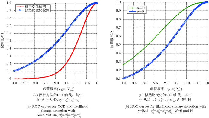 根据上述中z的概率密度函数[3]和相干系数的概率密度函数,可得到两种统计量的ROC曲线 (检测概率随虚警概率变化的曲线) 和不同N条件下z的ROC曲线,如图 1所示。分析可知,在相同虚警概率下,似然比变化统计量得到的检测概率比相干系数统计量得到的检测概率要高,尤其是在虚警率为10-2的情况下,检测概率提高了将近50%。因此,从理论上讲,似然比变化统计量的检测性能要好于相关系数统计量,而且通过增加N的值可以提高似然比变化统计量的性能。