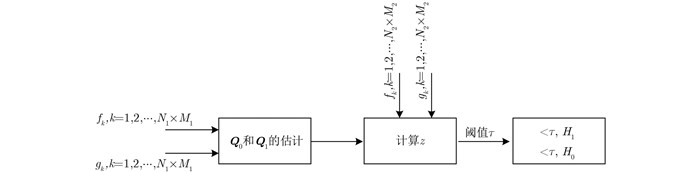 $z = - {\rm{Tr}}\left\{ {\left( {{\boldsymbol{Q}}_0^{ - 1} - {\boldsymbol{Q}}_1^{ - 1}} \right)\sum\limits_{k = 0}^{{N_2} \times {M_2}} {{{\boldsymbol{X}}_k}{\boldsymbol{X}}_k^{\rm{H}}} } \right\}$ | (13) |