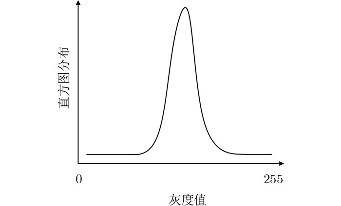 全局阈值的选取一般从直方图入手,一些经典的阈值分割算法,比如最大类间方差阈值分割,峰谷法,迭代式阈值选择[15],其重要的前提是图像的直方图具有明显的可分离性,即直方图具有明显的双峰。对于图像的变化检测而言,待检测图像与参考图像中大部分场景未发生变化,发生变化的区域仅仅占场景的很小一部分。因此,差异图像的直方图只会出现一个明显的波峰,代表未发生变化像素部分。而由于变化像素的数量较少,不同的变化内容会生成不同的变化统计量,因此代表变化像素的统计量直方图分布范围较广且分布平缓。理想差异图像的直方图如图 4所示。直方图波峰从左下降区进入平缓区的转折点可以作为分割未变化像素和变化像素之间的最佳阈值。