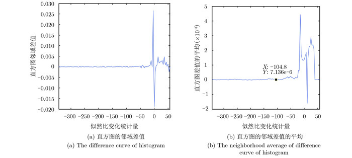 本文将n设为6,对图 5中直方图利用自动阈值选取方法得到的相邻直方图差值图和差值图的邻域平均分别如图 6(a)和图 6(b)所示,得到最佳阈值为-104.8。