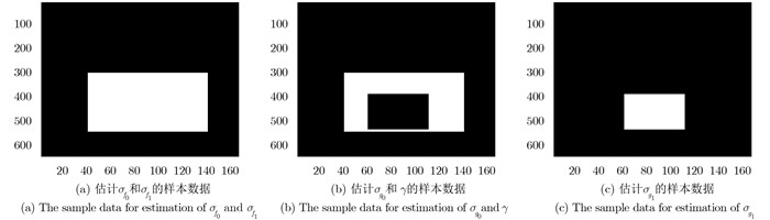 对于传统的似然比检测方法,选取图 8中的白色区域估计两个协方差矩阵,其中图 8(a)的样本大小为251×101,共25351个像素,图 8(b)的样本大小为17650个像素,图 8(c)的样本大小为151×51,共7701个像素,得到的两个协方差矩阵为: