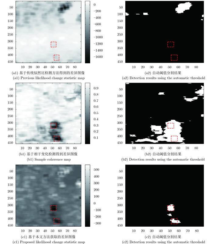 基于上述问题,本文在原有似然比检测算法的基础上做了两点改进:运用最大似然估计优化检测统计量中的似然参数,采用邻域滑动窗口估计每个像素点的特征矩阵,使矩阵的估计更加准确稳健;然后基于差异影像的直方图特点提出了一种基于邻域直方图差的自动选取阈值方法。实验结果表明,本文提出的方法与传统的似然比方法比具有很强的鲁棒性,与相干变化检测方法比检测性能优越,而且本文提出的基于直方图的阈值自动选取方法可以简单有效地选出合适的阈值,能够较好地将变化像素和未变化像素分离出来。