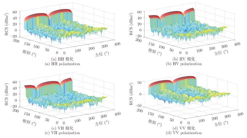 $\begin{aligned} {\sigma _{ij}}\left( {f,{\theta _{\rm{T}}},{\varphi _{\rm{T}}},{\theta _{\rm{R}}},{\varphi _{\rm{R}}}} \right) = 4\pi &{\left| {{S_{ij}}\left( {f,{\theta _{\rm{T}}},{\varphi _{\rm{T}}},{\theta _{\rm{R}}},{\varphi _{\rm{R}}}} \right)} \right|^2},\\ &i,j = {\rm{H}},{\rm{V}} \end{aligned}$ | (5) |