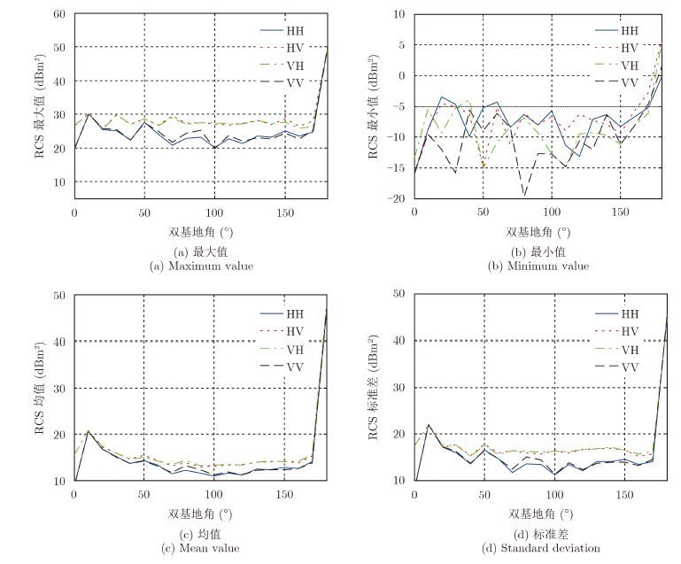 进一步我们统计了不同双基地角条件下双基地RCS的最大值、最小值、均值和标准差等参数,如图 4所示。从图中可以看出,双基地RCS最大值、最小值、均值、标准差在双基地角为零时(单基地模式),具有较小的值;在双基地角10°~150°范围内,RCS最大值比较变化不明显,而RCS最小值起伏较大,说明不同的视角与目标结构导致的结果,双基地角大于150°后,最小值随双基地角急剧增加;总体而言,交叉极化RCS的最大值、最小值、均值、标准差均大于共极化RCS。