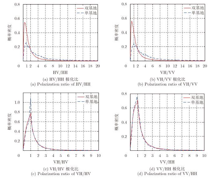 (2) 双基地共极化比与单基地共极化的极差、均值、标准差、偏度系数、峰度系数较为接近,说明单/双基地共极化比的统计特性类似,与图 5(d)一致;