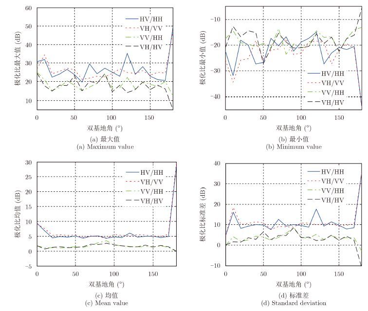 进一步,我们分析了不同双基地角条件下的极化比统计特性,图 6给出了不同双基地角条件下极化比统计的最大值、最小值、均值、标准差等参数,从图 6中可以看出交叉极化与共极化之比最大值、均值、标准差普遍大于共极化比、交叉极化比,交叉极化与共极化之比最小值普遍小于共极化比、交叉极化比,这说明交叉极化与共极化之比的动态大于共极化比、交叉极化比;交叉极化与共极化之比随双基地角变化规律基本一致,但起伏较为剧烈,共极化比、交叉极化比随双基地角变化规律基本一致,且均值和标准差保持稳定,说明不同的双基地角交叉极化与共极化散射变化不一致,两种交叉极化起伏特性一致,两种共极化起伏特性一致。