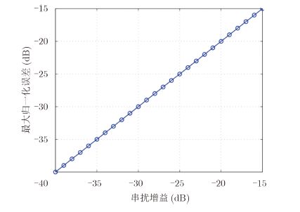 可以看到,MNE随着通道串扰增益按比例以分贝级增长。为了维持MNE小于-20 dB,发射的通道串扰需要小于-20 dB。