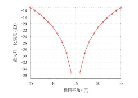3.2.1 法拉第旋转角根据式(3),当FR是发射中唯一的失真,即发射的是完美圆极化波时,FR角直接变为一项可被省略的加性相位项。如果发射极化波是非完美的,则FR将会如式(3)所示,对综合串扰d产生影响。