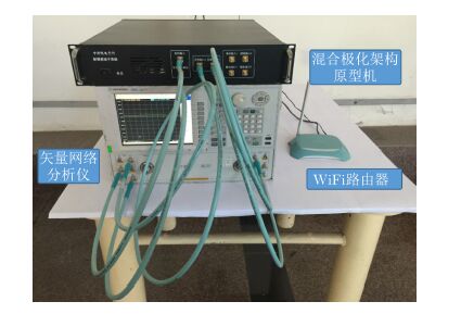图 7 使用VNA测试的改进混合极化架构的原型系统 Fig.7 Prototype system of the improved HP architecture measured by a VNA |
