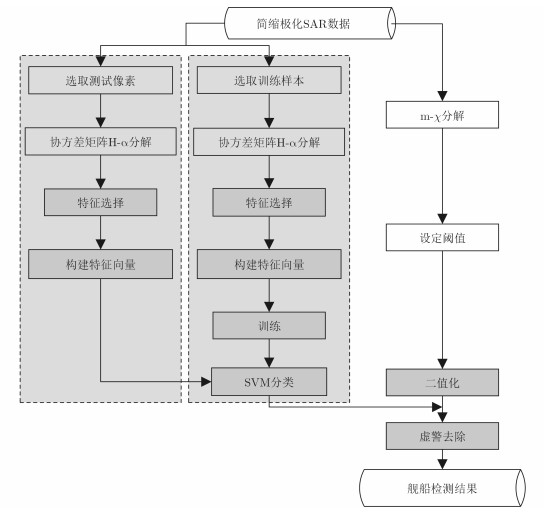 由于单独采用单个极化特征参数对船舶目标进行检测无法得到理想的检测结果,因此作者所在研究小组进一步对多个极化特征参数进行优选,提出了一种基于加权SVM和m-χ分解的简缩极化SAR船舶检测方法[47]。该方法利用ReliefF算法对不同极化参数进行选择,构建最优特征向量,再利用SVM分类器进行船舶目标检测,最后利用海洋和船舶不同散射机制强度的差异对虚警和模糊噪声进行去除。其算法流程如图 6所示。