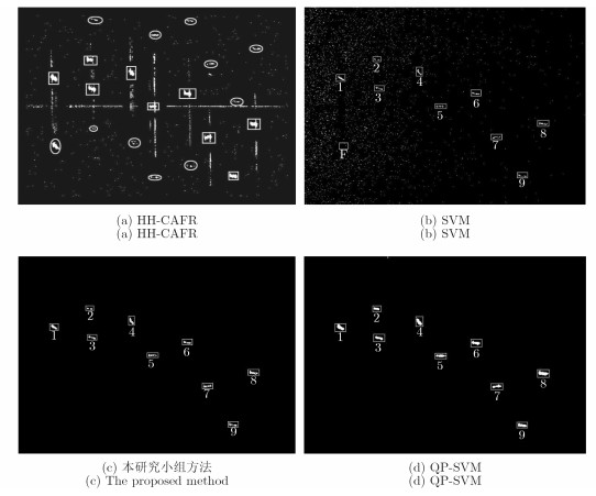 分别采用NASA JPL AIRSAR机载全极化模式和加拿大Radarsat-2星载全极化模式等不同传感器数据,模拟CTLR模式下的简缩极化数据进行实验验证,图 7分别为NASA JPL AIRSAR东京湾区域和Radarsat-2温哥华海港区域的Pauli合成图。图 8和图 9分别给出了NASA JPL AIRSAR东京湾区域和Radarsat-2温哥华海港区域不同算法的船舶目标检测结果,图中(a), (b), (c), (d)分别对应HH通道CAFR (HH-CFAR)、SVM、本研究小组提出的加权SVM和m-χ分解以及基于全极化数据SVM (QP-SVM)4种检测方法。