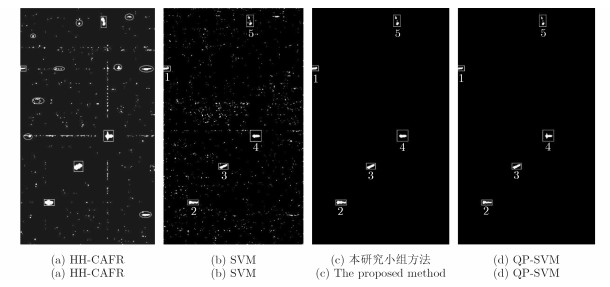由图 8和图 9可见,SVM方法和本研究小组提出的加权SVM方法都能够检测出船舶目标,但是SVM方法孤立点较多且存在严重的背景杂波引起的虚警。此外,由图 8可以看出,SVM方法检测结果目标结构不完整,船舶目标容易出现断裂的情况。与SVM方法相比,本研究小组加权SVM方法检测结果中没有虚警,并且船舶目标结构保持较完整,主要原因是该方法对特征向量进行优选,去除了相关性高和置信度小的特征向量,采用了优化的特征向量。另外,本研究小组方法与全极化检测结果相比,取得了与全极化数据相近的结果,简缩极化SAR在收发通道减少,信息量没有全极化SAR丰富的情况下,能够取得与全极化近似的结果,进一步验证了本研究小组方法的有效性,同时再一次充分体现了简缩极化系统在海洋遥感尤其是海上船舶目标检测中的优势和应用潜力。