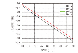 通过仿真分析不同振动幅度,建模误差RMSE和接收机信噪比SNR的关系。图 3是在振动幅度分别为10-1λ, 10-2λ, 10-3λ, 10-4λ,建模误差RMSE随信噪比SNR变化的关系图。随着信噪比SNR的增大或者振动幅度的减小,建模误差将逐渐减小,但当振动幅度小于10-2λ时,信噪比将是影响建模误差的主要因素。从仿真结果可以看出当SNR>20 dB,振动幅度小于10-1λ时,都能满足RMSE < -20 dB。