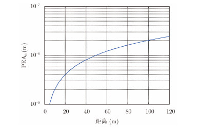 将图 5给出相位噪声指标代入到式(13),可以计算得到PEA0随距离变化的曲线如图 6所示。从图 6中不难看出,随着距离的增大,PEA0逐渐增大,且增长趋于平缓,与理论结果相符。
