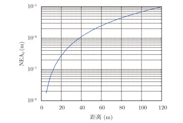 基于上述参数设计,通过式(16)计算得到NEA0随距离变化的曲线如图 7所示。可以看出,热噪声等效平均振幅的变化特性与相位噪声的变化趋势相似,但振幅要比相位噪声等效平均振幅大两个数量级以上,因此可以得出结论:热噪声对振动测量的影响远远大于相位噪声的影响,在系统分析与设计时,应将热噪声作为重点分析的对象。