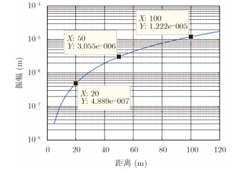 假设最终输出最小信噪比要求SNRmin=5 dB,根据式(18)计算系统的多普勒测量灵敏度随距离变化的曲线,如图 8所示。在20 m的时候能够测量到0.5 mm左右的振动,50 m时能够测量到3 mm左右的振动,100 m时能够测量到12 mm左右的振动。