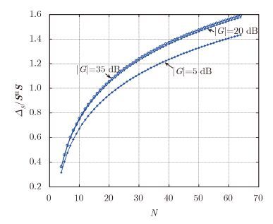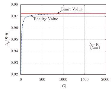从图 2可见,随着子脉冲数N的增大,$\eta $的值单调增加,这意味着作为判断干扰存在与否的鉴别量性能也随着子脉冲数的增加而改善。这个结论在直观上可以这样理解:对于N=4和N=8这两种情况,发射子脉冲的极化按照${{{P}}_k} = {\left[{\cos \left( {\frac{{k\pi }}{N}} \right),\sin \left( {\frac{{k\pi }}{N}} \right)} \right]^{\rm T}}$,$k = 0,1,2,·\!·\!·,N - 1$的取法,N=4的情况显然包含在N=8中,即后者多包含了${{{P}}_k} \!=\! {\left[\! {\cos \left(\! {\frac{{k\pi }}{N}}\! \right),\sin \!\left( \!{\frac{{k\pi }}{N}} \!\right)}\! \right]^{\rm T}}$,k=1,3,5,7四组极化,这必然导致散度值的增加。另外观察图 2的|G|=5,|G|=20,|G|=35三条曲线可以发现,随着转发增益|G|的增大,相应的$\eta $值也随之增大,但是从|G|=20到|G|=35增加的幅度并不十分明显。图 3给出了N=16时,$\eta $随|G|增大的渐进过程。由图 3可见,即使当|G|不是特别大时,鉴别量$\eta $的值也是十分接近极限值的,这说明,本鉴别算法适用范围是较为宽泛的。