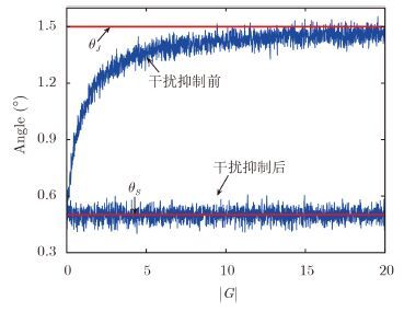 最后,在判定存在拖曳式干扰后,采用本文所提出的办法进行抑制。图 5给出了测角值随干扰转发增益|G|的变化曲线,其中θS=0.5°,θJ=1.5°,信噪比为10 dB,干扰抑制之前的角度测量值取所有子脉冲组合测角的均值。由图 5可见,在未采用抑制算法之前,随着转发增益的增大,角度测量值将逐渐离开真实值过渡到θJ,采用本文算法后,角度测量值在真实值附近波动,表明拖曳式诱饵干扰得到了有效的抑制。