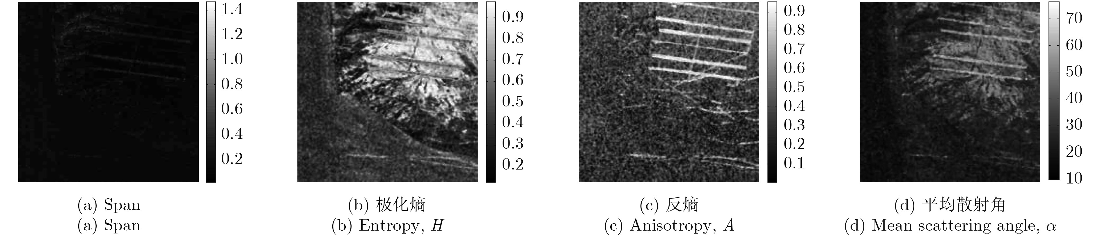3.1 基于实测数据的极化特征分析图5给出了图4(a)黄框所示的研究区域的极化特征。基于上面的分析,下面结合实地考察结果以及图4(a)中所示的Pauli伪彩色图对4个特征进行目视解译。在图5(a)所示的Span影像中,我们可以识别出潮间带的大致轮廓以及金属隔离网等,但是潮间带内部细节的识别能力较差,并且潮间带和海洋的边界比较模糊。图5(b)给出了极化熵图像,从图中我们可以识别出海面,以及潮间带中的淤泥滩,草地以及暗色的残留水体等,并且和海面的区分较为显著,但是对金属隔离网的识别能力较差。图5(c)中的反熵可以很好地识别金属隔离网,但是无法识别出其他地物。而对于图5(d),平均散射角可以对潮间带区域中的地物进行一定的识别,但是不能很好地区分海面和潮间带中的水产养殖。对比Span、极化熵、反熵和平均散射角4张图,可以发现极化熵可以对除去金属隔离网之外的地物有着最好的视觉判别而反熵作为补充可以很好地识别出金属隔离网区域。因此,极化熵结合反熵,可以给出最好的视觉判别效果。