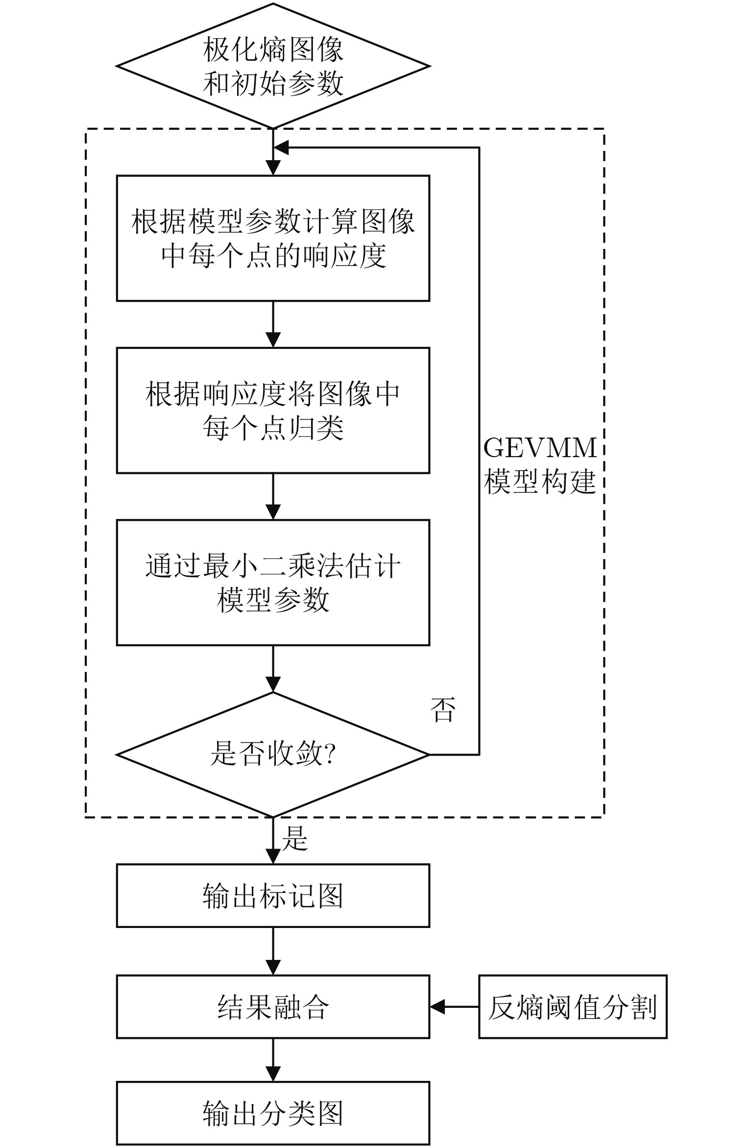 2.4 基于GEV模型的分类方法对于潮间带区域的极化熵图像H的地物分类可以分为两个步骤:首先是GEV混合模型的计算,然后将模型映射到图像空间中实现分类。其中最重要的一步是GEVMM的计算。本文以EM算法为基础,来实现对GEVMM的构建。
