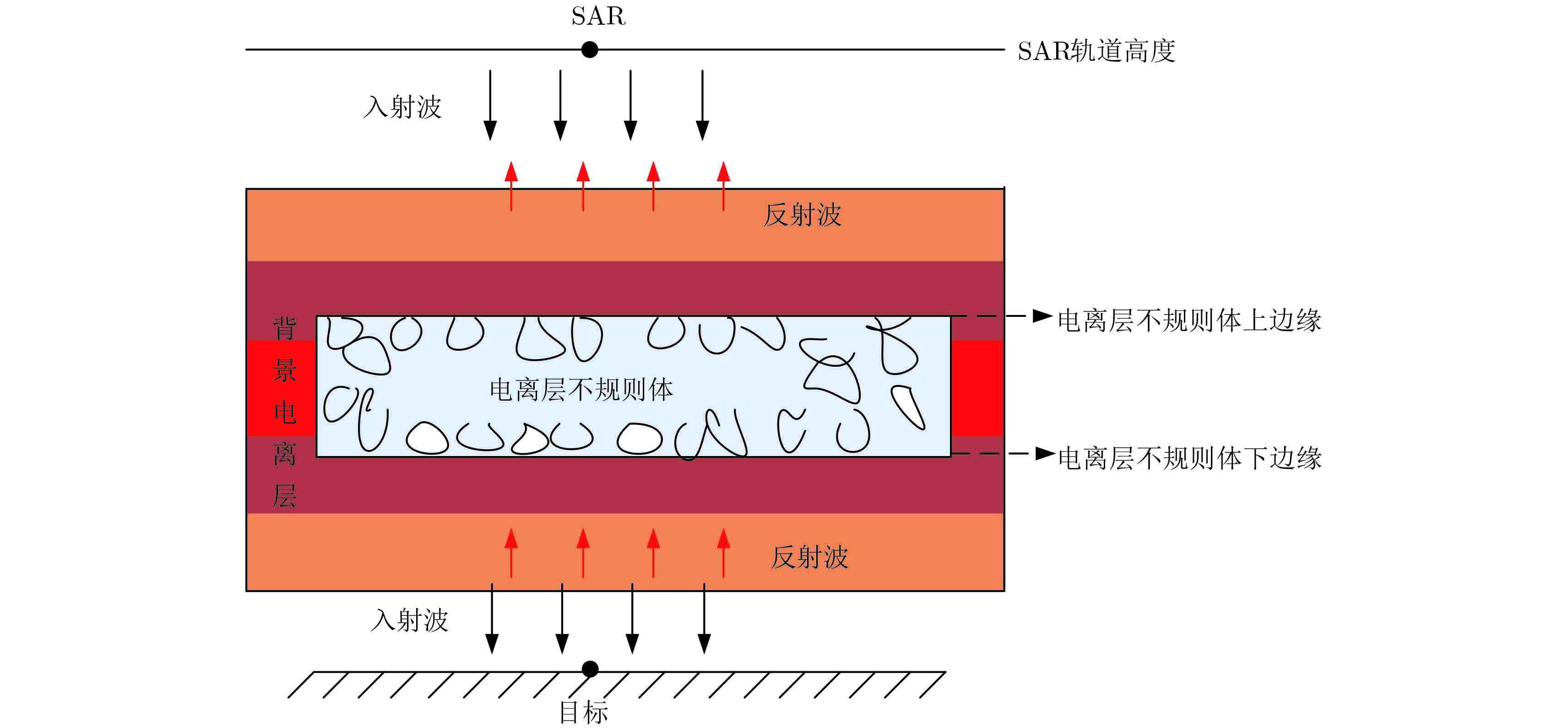 对于SAR系统而言,SAR信号双程通过电离层不规则体,其传播几何如图11所示,为简化分析,我们假设SAR信号垂直入射到电离层。