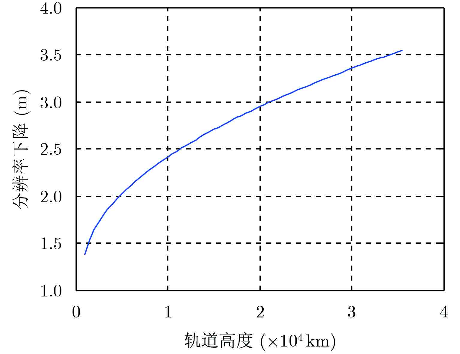 从图11可以看出,电离层不规则体对SAR信号的影响包括下行信号的影响和上行信号的影响,从式(1)和式(2)可以看出,在其它条件相同的前提下,随着传播距离的增加,电离层不规则体导致的脉冲均方宽度和平均到达时间也随之增大。对于低轨SAR系统,由于轨道高度较低,现有文献大都认为电离层不规则体对距离向成像无影响,然而,中高轨SAR传播距离与低轨道SAR相比大大增加,其受电离层不规则体的影响程度也将相应增加,图12给出了不同轨道高度下,电离层不规则体导致的距离向分辨率的下降,仿真参数见表1。
