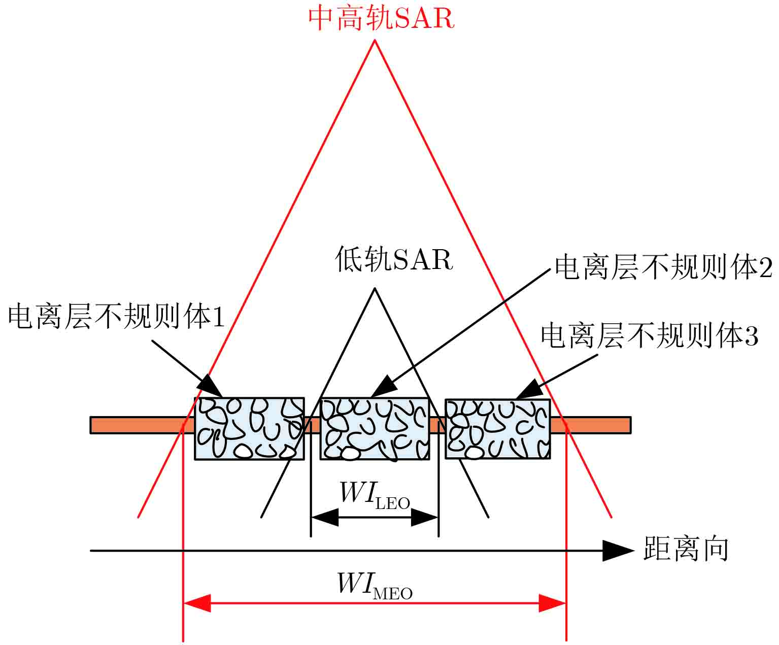 图 13 中高轨SAR条件下,电离层不规则体在距离向分布示意图 Fig.13 Sketch of range beam on ionospheric irregularity for MEO/LEO SAR |