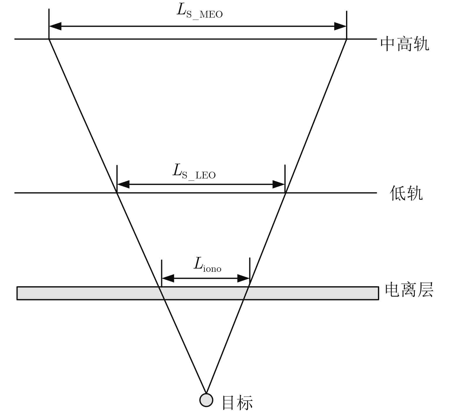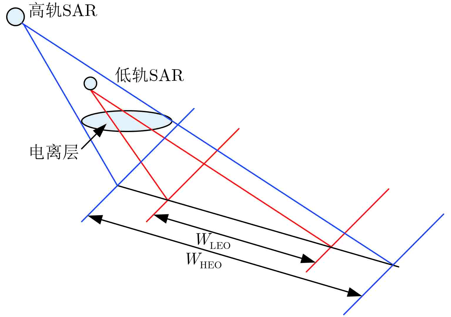 图 8 中高轨道/低轨道SAR距离向横跨电离层尺度示意图 Fig.8 Sketch of range beam on ionosphere for MEO/LEO SAR |