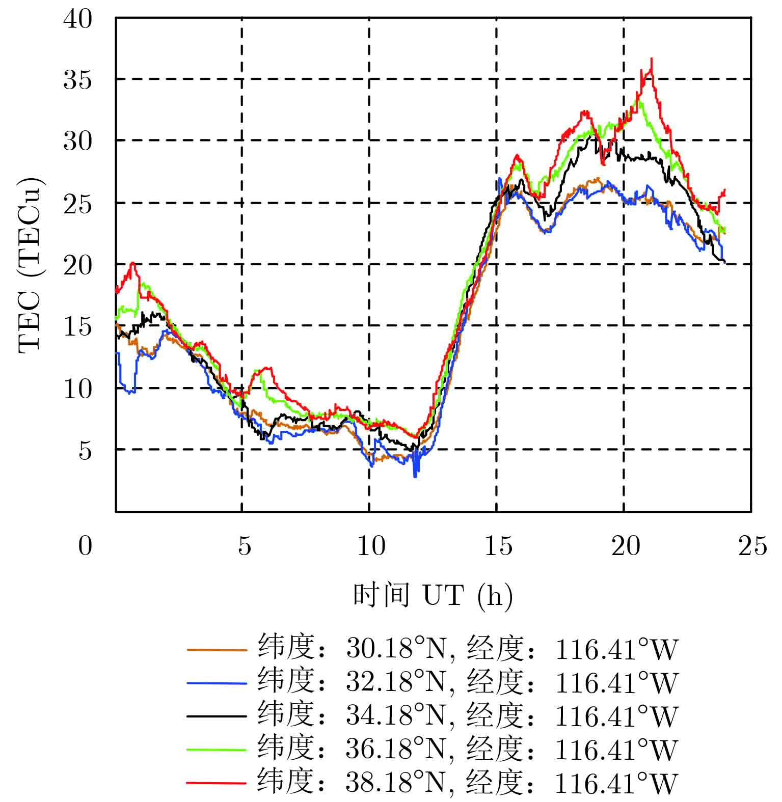 图 6 不同纬度,相同经度下,VTEC随时间的变化 Fig.6 Ionospheric VTEC vs. time (different latitude) |