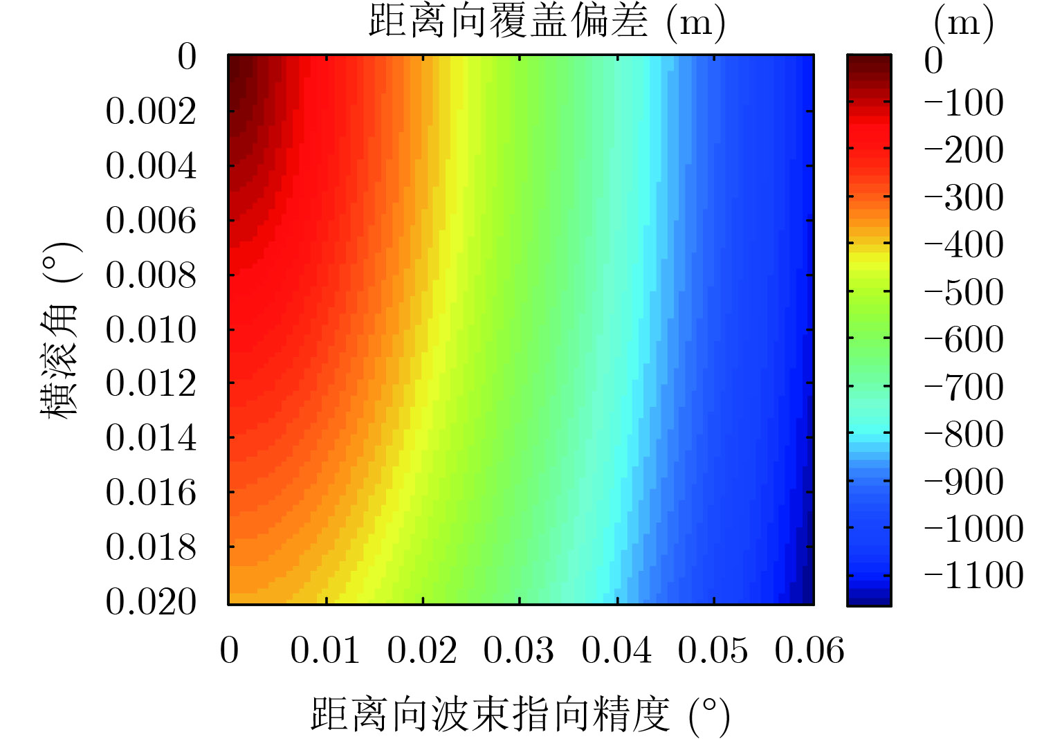 0°~0.06°的波束指向误差对距离向重叠幅宽的影响如图15所示。横滚角会在距离向产生波束控制误差,对距离向覆盖偏差产生影响,0.02°的姿态控制误差对重叠幅宽的影响如图16所示。横滚角从0°步进至0.02°,距离向波束指向精度从0°步进至0.06°情况下,两者对距离向重叠幅宽的综合影响如图17所示。上述结果表明,0.02°的姿态控制误差对距离向重叠幅宽的影响为368 m, 0.06°的波束指向误差对距离向重叠幅宽的影响为1100 m,由于波束指向和姿态控制导致的误差均为随机误差,所以综合影响采用几何平均数的形式,两者综合之后对距离向重叠幅宽的影响为1164 m。考虑到轨道控制精度的影响,在重轨工作模式下,两次测量中卫星的位置会在一定范围内偏移,在卫星姿态误差和波束指向误差基础上,系统设计中应综合考虑卫星位置偏移的影响。